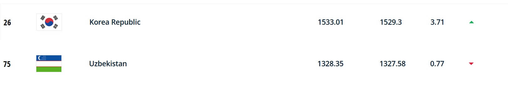 대한민국 26위 : 우즈베키스탄 75위